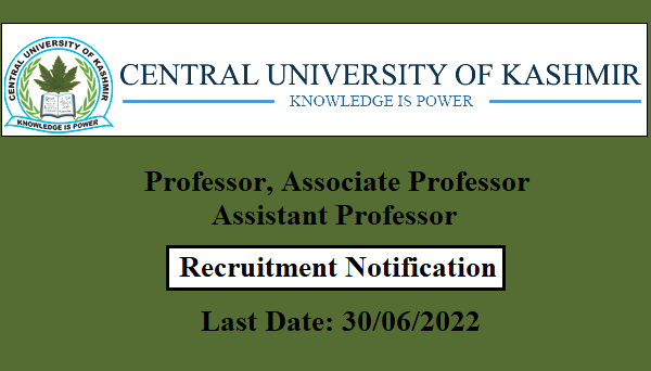 سنٹرل یونیورسٹی آف کشمیرنے پروفیسر،اسوسی ایٹ پروفیسر،اسسٹنٹ پروفیسرکی مخلوعہ 117جائیدادوں پر بھرتی کیلئے اعلامیہ جاری کرتے ہوئے اہل امیدواروں سے آن لائن درخواستیں طلب کی ہیں۔آن لائن درخواست کے ادخال کا عمل جاری ہے اور آخری تاریخ 30جون 2022 ہے۔ڈاؤن لوڈ کردہ درخواست فارم اور دیگراسنادات یونیورسٹی کے ریکروٹمنٹ سیکشن میں 9 جولائی2022 سے قبل جمع کروائیں۔
