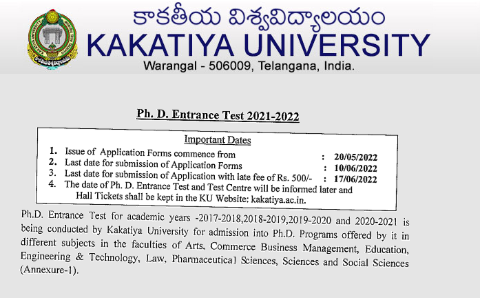 کاکتیہ یونیورسٹی،ورنگل ،تلنگانہ نےتعلیمی سال17-2018،2018-2019،2019-2020اور 2020-2021 کیلئے پی ایچ ڈی داخلہ امتحان کا نوٹیفکیشن جاری کرتے ہوئے اہل امیدواروں سےدرخواستیں طلب کی ہیں۔