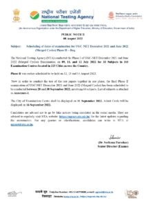 نیشنل ٹسٹنگ ایجنسی نے یو جی سی نیٹ کے دوسرے مرحلے کے امتحانات کو ملتوی کردیا۔واضح رہیکہ جاریہ ماہ کی 12،13اور 14 تاریخ کو دوسرے مرحلے کے تحت جملہ 64 مضامین کے امتحانات منعقد کرنے کا اعلان کیاگیا تھا تاہم ایجنسی نے امتحانات کو ملتوی کرتے ہوئے 20 سمتبر تا 30 سمتبر 2022 کے درمیان منعقد کرنے کا اعلان کیا۔امتحانی مراکز کی فہرست 11ستمبر کو ویب سائٹ پرجاری کی جائے گی اور آڈمیٹ کارڈز کی اجرائی 16 ستمبر سے عمل میں آئے گی۔